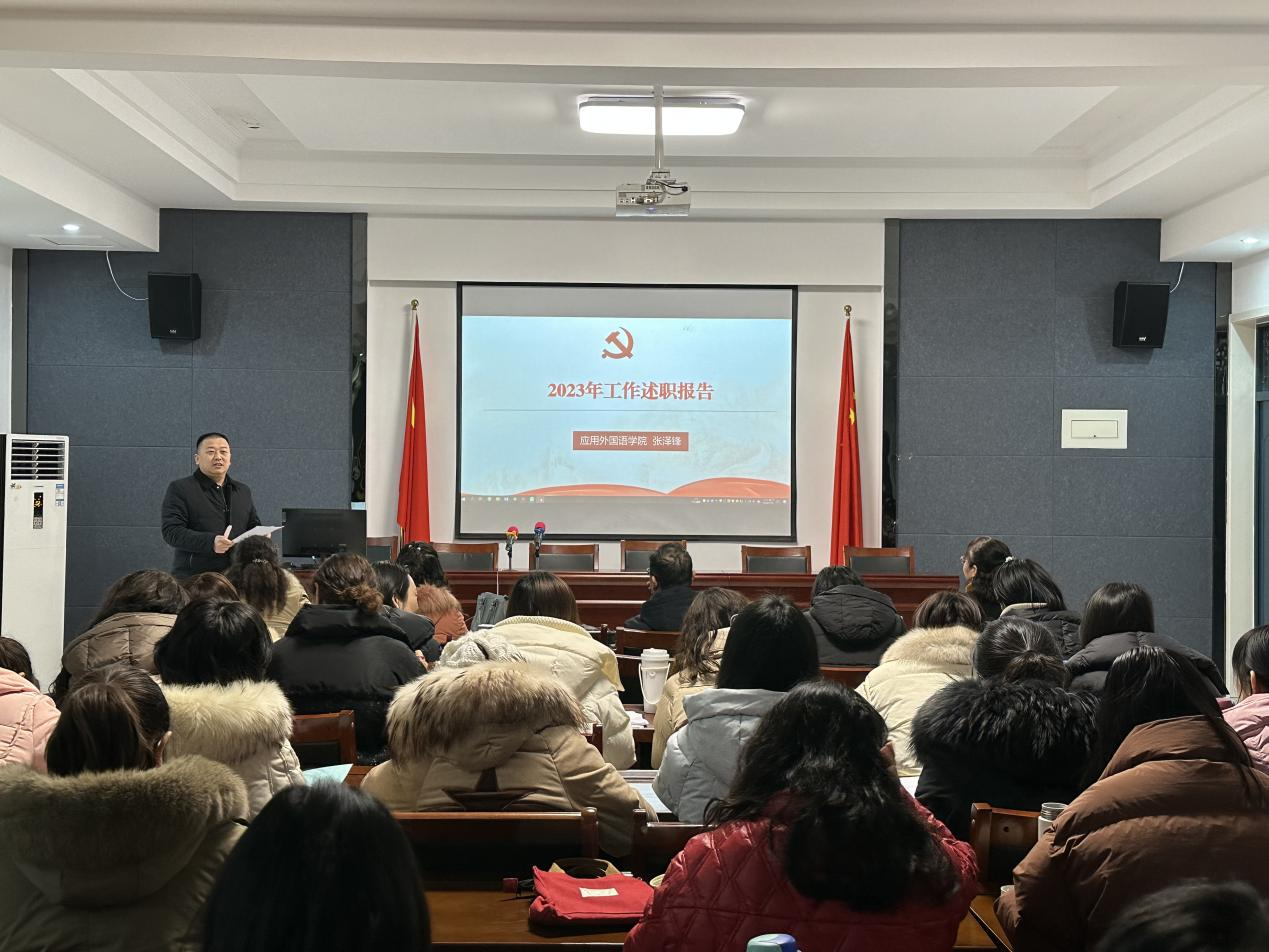 会上,刘晓鹂从基础党建工作和业务工作两大方面进行总结,详细汇报了学院上年度在专业建设、师生技能竞赛、科研、师资队伍建设、招生及就业、校友联络等方面取得的成绩及存在的问题,并指出学院今后努力的方向。外语学院副书记张泽锋、副院长刘文敏、团总支书记蒋曾,以及三个基层教研室负责人依次进行了年度工作述职。