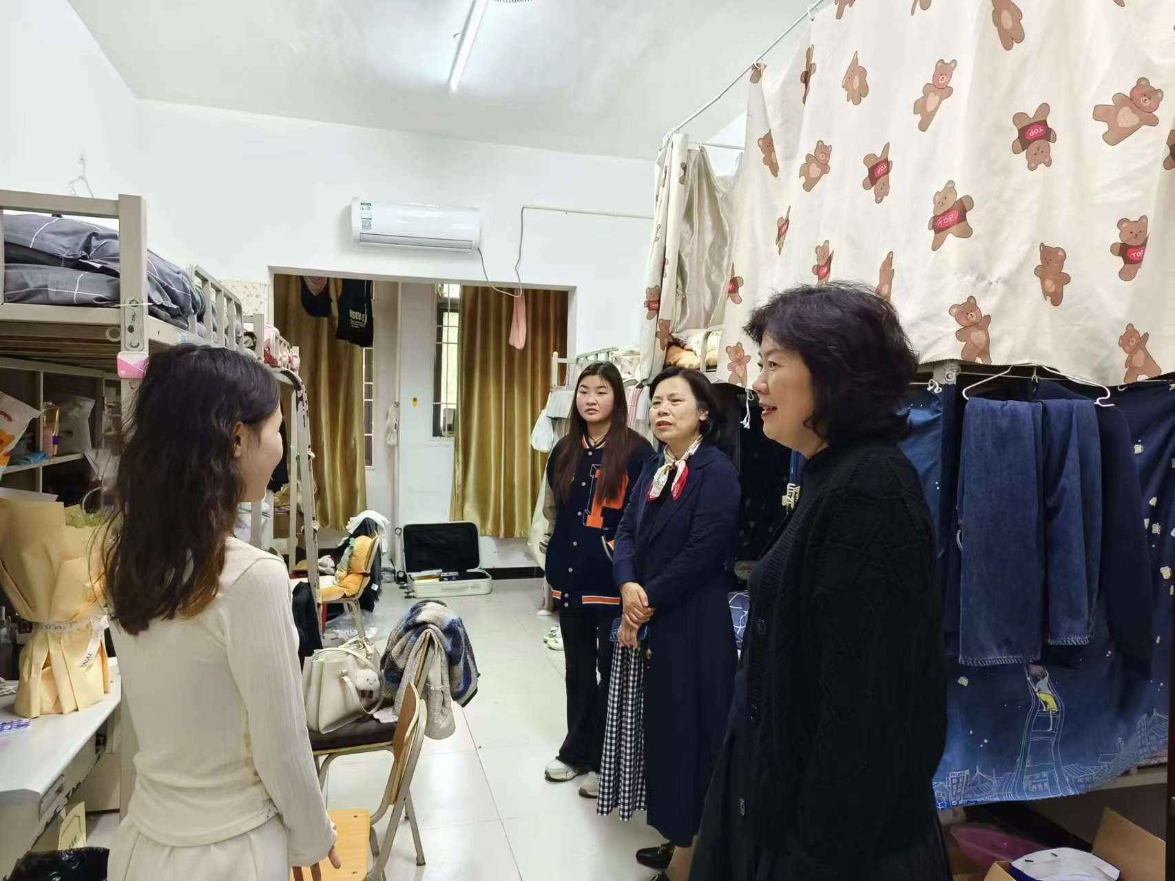 蒋有红先后走进东九楼9107、9201和东六楼6105、6106等宿舍,与同学们亲切交谈,详细了解她们的学习和生活情况,提醒同学们养成良好的习惯。她强调同学们要时刻提高防火防盗等安全意识,离开宿舍要关闭电源、锁好门窗。校园内外要注意交通安全、人身安全及财物安全,鼓励同学们学会照顾自己。此外,蒋有红还就建设积极健康的宿舍文化和融洽和谐的宿舍关系等进行了细致入微的指导。