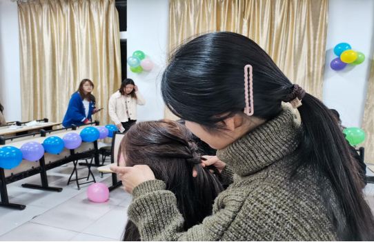 活动在欢快的音乐声中拉开了帷幕,“击鼓传花”游戏正式开始,只见同学们一个个热情高涨,凝神聚目,动作敏捷,现场到处充满欢声笑语。在游戏轻松欢快的氛围中,传花失败的同学们纷纷表演了各自拿手的才艺。紧接着花式绑头比赛一名同学为另一名同学设计并扎出漂亮且独特的发型。女生们各个心灵手巧,不一会儿时间老式麻花辫、鱼骨辫、拳击辫等各式各样的发型涌入眼帘,在场围观的同学无不为之惊叹,纷纷现场学艺,跃跃欲试。最后全场女生齐声合唱英文歌曲a big big world活动圆满结束