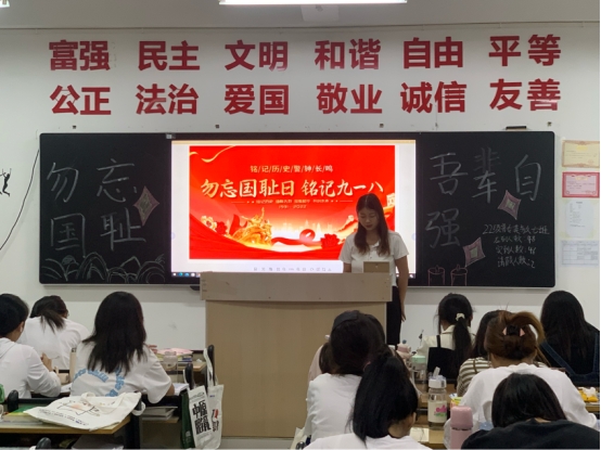 活动伊始,各班团支书向同学们讲解“九一八”事变的由来和中国抗战胜利的意义,通过图文并茂的形式讲述抗战时期中国人民不屈的斗争以及一些可歌可泣的鲜活故事。接着,团支书带领同学们观看有关“九一八”事变的视频,通过视频使同学们仿佛置身于那段烽火岁月中。最后同学们进行了主题演讲,昂扬激奋的声音在同学们耳中回荡,同学们纷纷感悟:“现在的幸福生活来之不易,作为青年人的我们更要在党的领导下砥砺奋进,在实现中国梦的伟大历史进程中,书写人生华章,绽放青春光彩。”