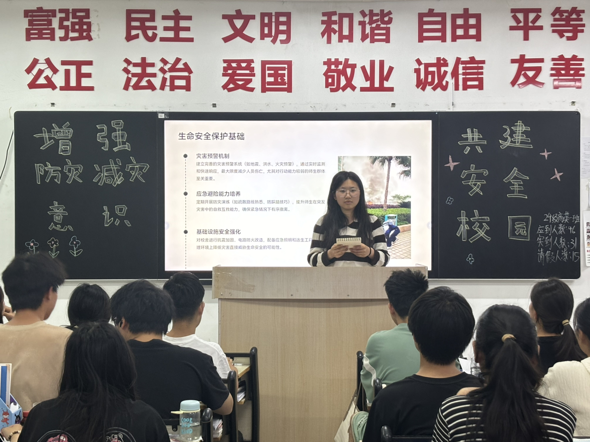 首先,各班班长结合生动的视频、图片,直观展现灾害的破坏力,强调防灾减灾对生命财产安全的重要意义,迅速引发同学们的关注。接着,各班班长详细阐述地震、火灾、暴雨等常见灾害的特点与应对方法。接下来,班长们还通过案例分析、现场演示等方式,让同学们更深入理解和记忆这些应对方法。最后,同学们围绕“如何在日常生活中落实防灾减灾措施”展开热烈讨论,大家结合自身生活实际,提出许多切实可行的想法。
