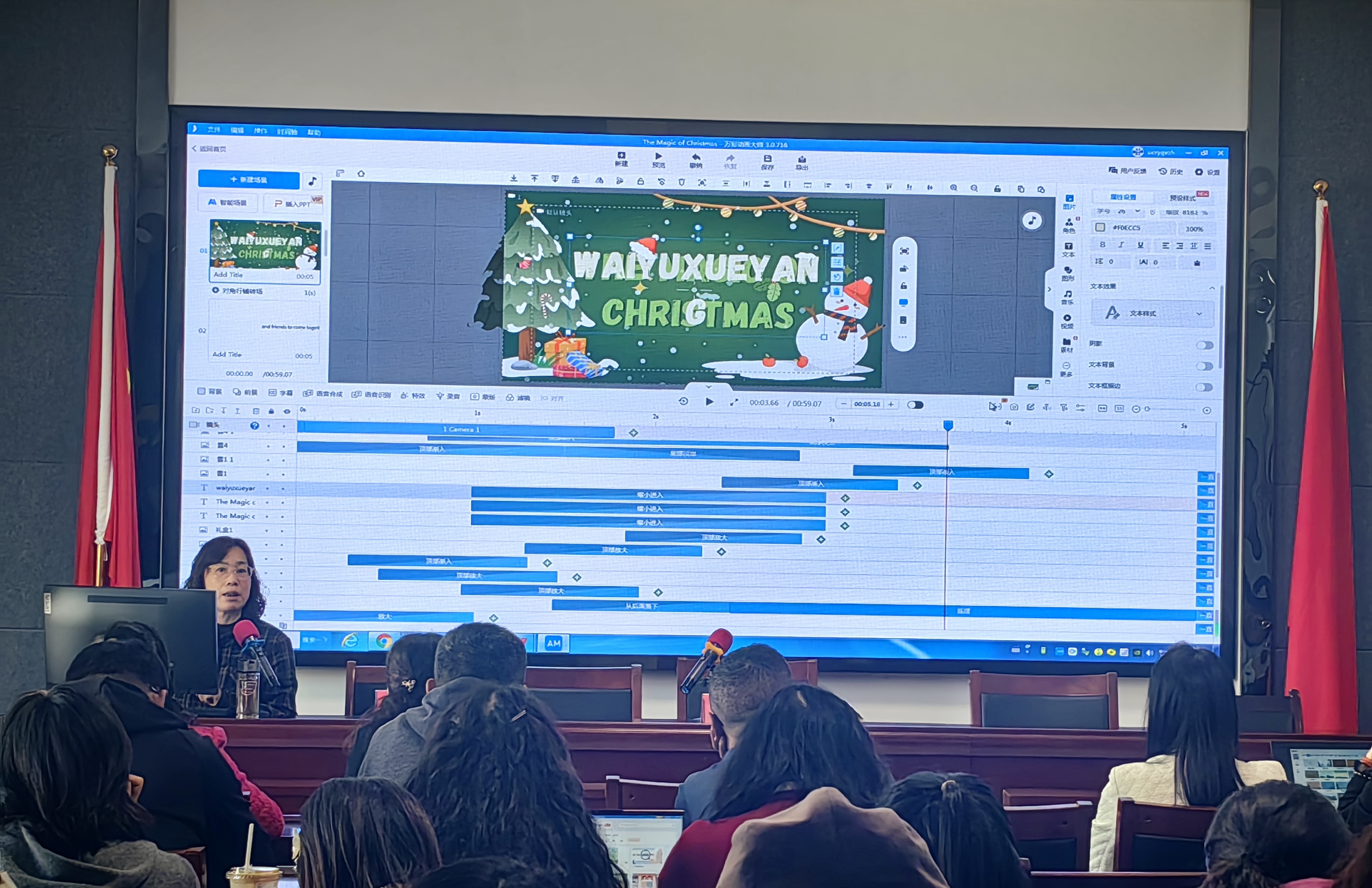 汤秀芳结合实操和讲解,理论联系实际,深入浅出,娓娓道来。除简单介绍“万彩动画大师”软件的下载、安装等注意事项外,她重点围绕这款软件的制作方法与步骤展开,主要介绍了场景的构建、基本的人物素材方法的使用和如何添加自己想要的效果等等。讲座干货满满,精彩纷呈,弥补了微课教学中动画制作的技术不足。