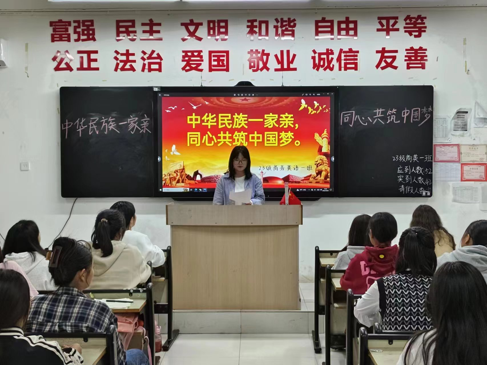 活动伊始,由各班团支书带领本班同学观看相关主题视频,从丰富多彩的视频中领略中华民族共同体的精神内涵。活动第二项,由学生代表上台演讲,对“中华民族一家亲,同心共筑中国梦”主题活动发表自己的感悟,并向同学们发出倡导。活动最后一项,由各班团支书就“中华民族一家亲,同心共筑中国梦”的提出、内涵以及历史渊源结合生动的案例对学生进行详细的讲解,并对此次该活动的开展作出总结,再次倡导学生们以实际行动同心共筑中国梦!
