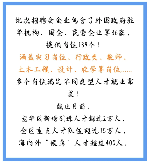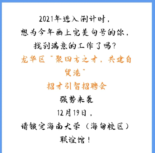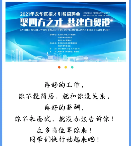 海口市龙华区2021年招才引智招聘会(beat365官方网站专场)定于12月19日(本周日)上午08:30-12:00在联谊馆举行,此次参会单位包含了外国政府驻华机构、国企、民营企业等36家用人单位单位,提供的岗位年薪均在6万以上,请大家积极参加!