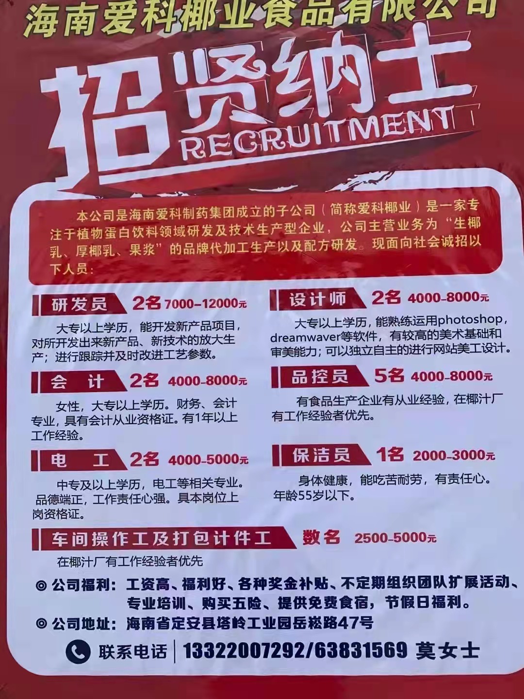 海南爱科椰业食品有限公司招聘