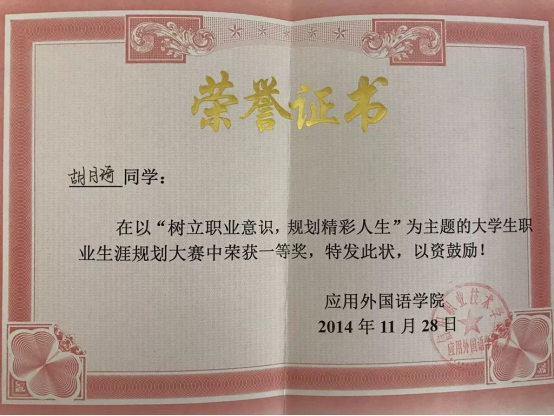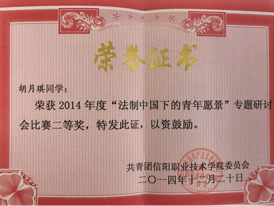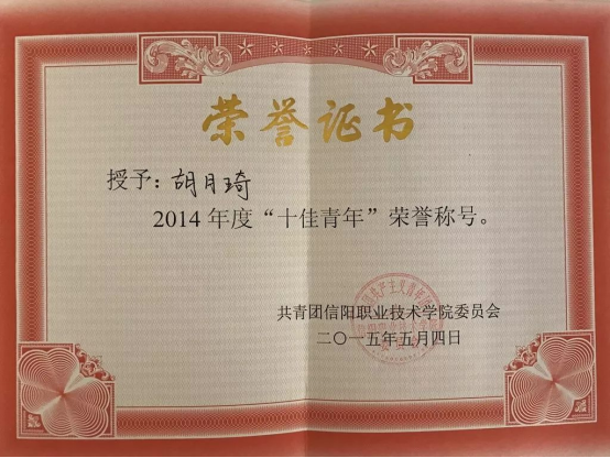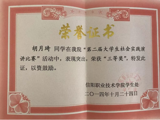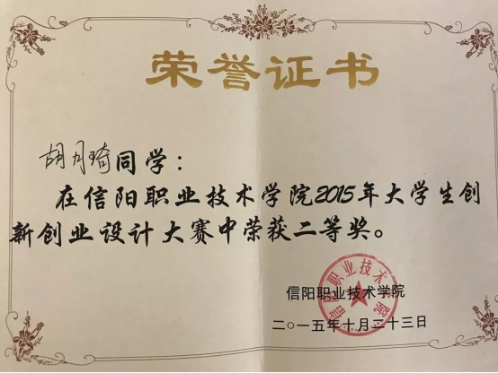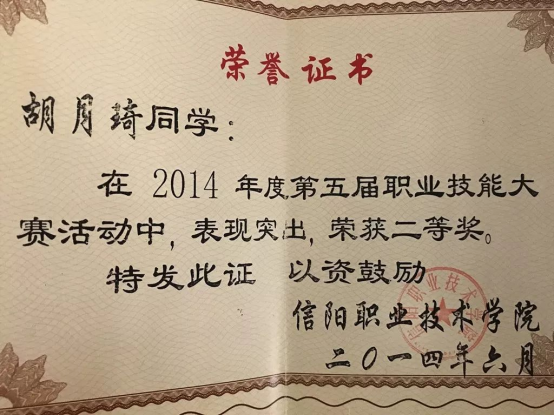 大学三年中,胡月琦积极参加学校各种技能活动,参与各种比赛:2014年获得beat365英国官网网站“十佳青年”荣誉称号;2014年度第五届职业技能大赛活动中,荣获二等奖;2014年度“法制中国下的青年愿景”专题研讨会比赛二等奖;2014年度“第二届大学生社会实践演讲比赛”中荣获三等奖;2015年度,大学生创新创业设计大赛中荣获二等奖;2016年5月,加入中国共产党。