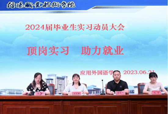 为了引导学生做好顶岗实习前的各项准备,推进实习工作的顺利开展,2023年6月21日下午四点半,beat365英国官网网站在图书馆报告厅举行以“顶岗实习、助力就业”为主题的2024届毕业生实习动员大会。外语学院党总支副书记张泽锋、教学副院长刘文敏、实习专干陈宇及全体毕业生参加了此次大会,会议由教务办公室主任李静主持。