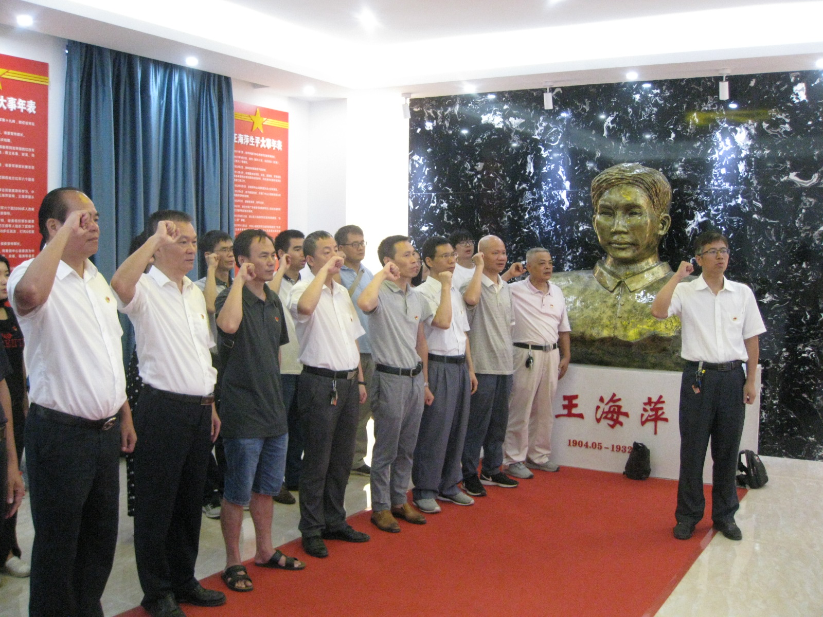 活动中,大家首先来到王海萍、梁惠贞烈士纪念碑,学工处处长陈卫东同志带领大家向烈士纪念碑敬献鲜花,默哀,集体三鞠躬致敬。随后,参观王海萍纪念馆,beat365官网校友蔡泽进同志现场讲解,详细生动地讲授了王海萍烈士光辉而短暂的一生英雄事迹。透过一幅幅珍贵的历史图片、文献资料和王海萍烈士的珍贵遗物,重温了党的光辉历程,深切表达了缅怀之情,受到了一次生动而深刻的党性教育。最后,在肃穆的纪念馆展厅里,学院党委书记邓秀成同志带领全体党员同志紧握右拳,饱含激情,庄严宣誓,重温入党誓词。
