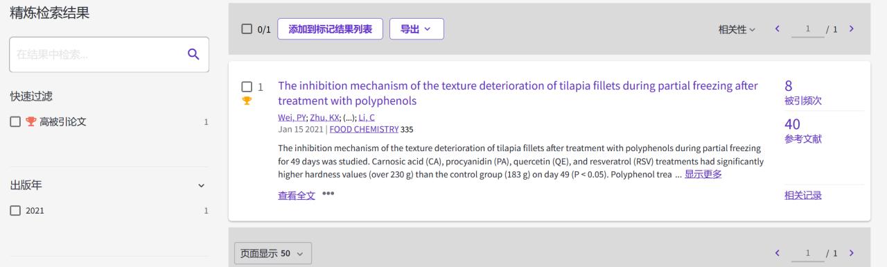 近日,根据ESI公布的最新数据显示,beat365官方网站热带水产品加工与贮藏团队李川副教授课题组在农林科学领域Top期刊《Food Chemistry》(影响因子7.514)发表题为 “The inhibition mechanism of the texture deterioration of tilapia fillets during partial freezing after treatment with polyphenols”的研究论文入选全球前1%ESI高被引论文。