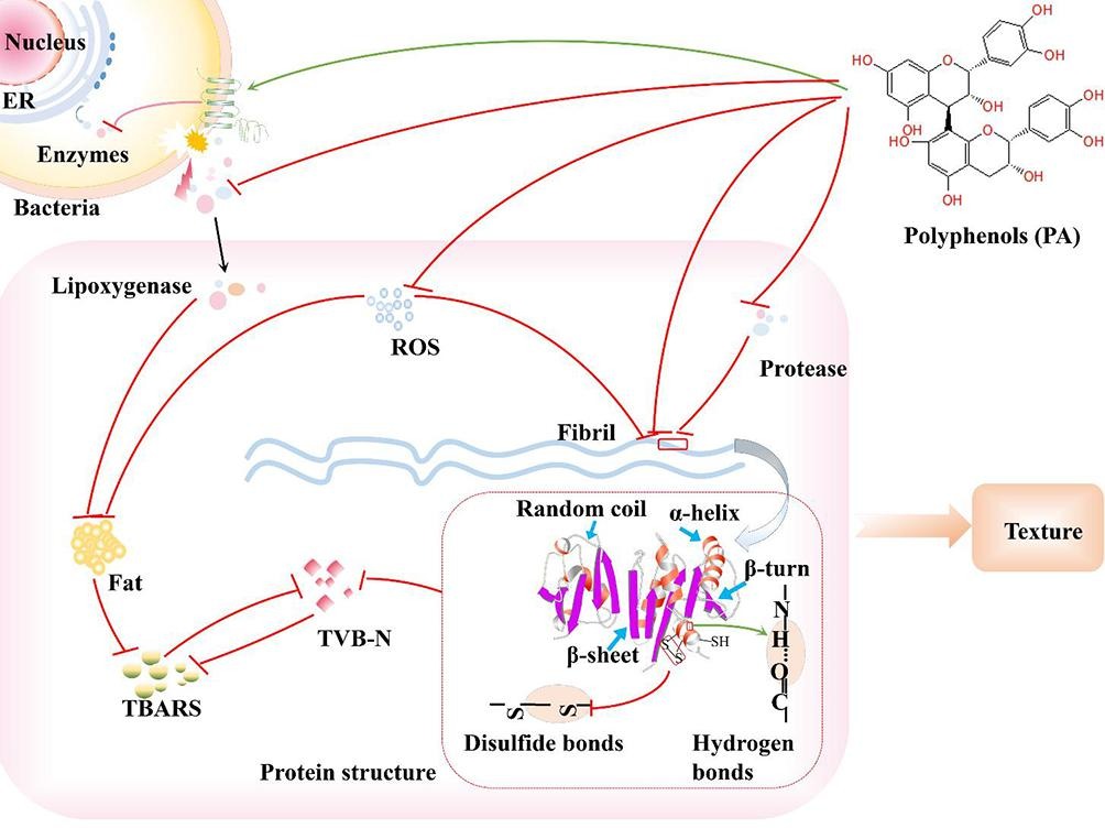 利用天然化合物保持水产品的品质已成为新的研究热点。本研究以罗非鱼片为研究对象,基于抗氧化性和抑菌性能对多酚进行筛选后,协同微冻保鲜技术,探究鱼片在储藏过程中的脂质氧化、质构、分子间作用、微观结构、肌原纤维蛋白构象和微生物多样性等变化规律,阐明多酚抑制微冻鱼片品质劣变的机理,为罗非鱼产品保鲜应用提供了创新思路。