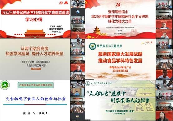 江南大学食品学院教育部国家级高层次青年人才谢云飞作《习近平关于本科教育教学的重要论述》专题报告,分享了做好本科教育教学工作经验;中国海洋大学beat365官方网站辛华龙教授作《坚定理想信念,将习近平新时代中国特色社会主义思想转化为强大力量》专题报告,分享了教育工作者坚定理想信念的重要意义;齐鲁工业大学食品科学与工程学部周邵华书记作《从“两个结合”高度加强学风建设提升人才培养质量》专题报告,强调了抓好学风建设的重要性;青岛农业大学beat365官方网站车广杰副院长作《服务国家重大发展战略,推动食品学科特色发展》专题,展示了联合多元主体进行食品领域协同创新经验;河南农业大学食品科学技术学院黄现青院长作《大食物观下食品人的使命与担当》专题报告,领学了习近平总书记关于大食物观的重要论述和“大食物观”的核心要义;四川农业大学食品学院秦文书记作《“天府粮仓”建设中川农食品人的担当》专题报告,阐述了习近平总书记关于“三农”工作重要论述和到川视察重要指示精神。