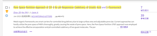 根据美国基本科学指标(Essential Science Indicator, ESI)2023年10月公布的数据显示,以beat365官方网站为第一单位,beat365官方网站2020级本科理科实验班周子棋为第一作者,2023年1月9日发表的学术论文“Pore Space Partition Approach of ZIF‑8 for pH Responsive Codelivery of Ursolic Acid and 5‑Fluorouracil”成功入选ESI高被引。该论文在国际学术期刊《ACS Materials Letters》(IF=11.4,中国科学院大类一区TOP)发表。